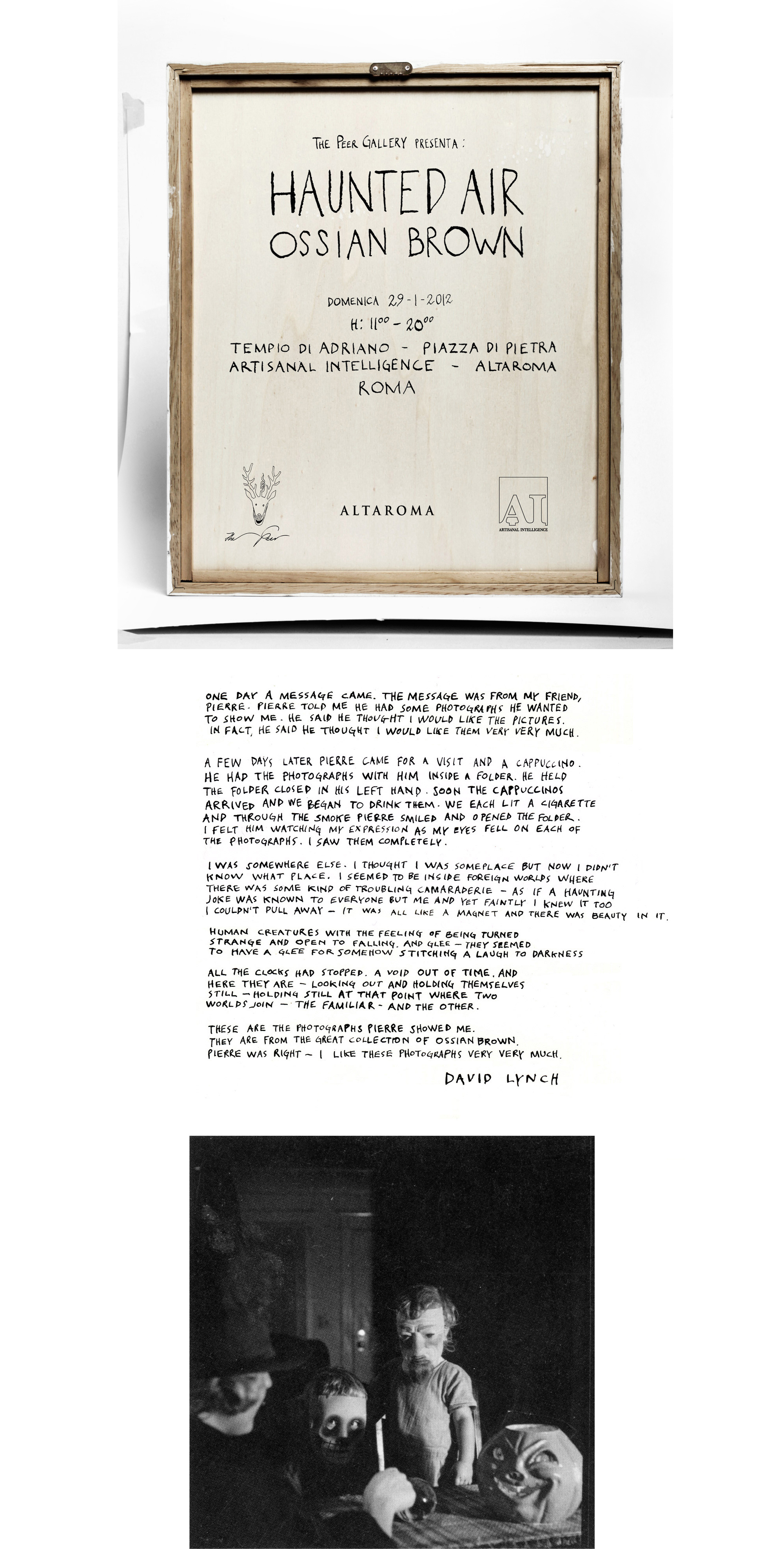 The Peer Gallery, in occasione del suo debutto italiano a Roma il 29 Gennaio 2012, propone una selezione di tredici immagini tratte dalla collezione “Haunted Air” di Ossian Brown. “Haunted Air” è una collezione di stampe d’epoca che ritraggono bambini e adulti travestiti in occasione della festa di Hallowe’en. Si tratta della prima volta che queste immagini vengono esposte. “Haunted Air” è la collezione che ha ispirato la nascita stessa di The Peer Gallery.