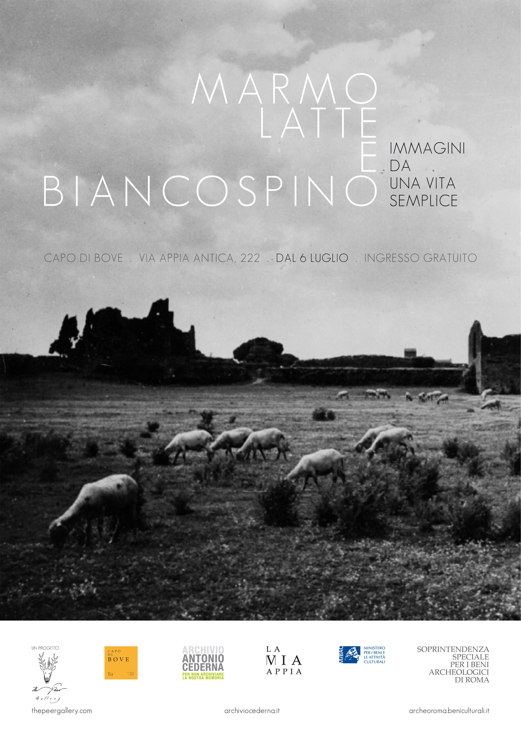 Nel complesso di Capo di Bove, Via Appia Antica 222, è stata allestita una nuova galleria fotografica dal titolo “Marmo, Latte e Biancospino”. Si tratta di una raccolta di fotografie che propone un punto di vista originale dal quale contemplare il paesaggio archeologico. Il punto di vista è quello etno-gastronomico e il paesaggio è principalmente quello dell’Appia Antica. The Peer Gallery , che ha ideato l’esposizione, cura mostre site-specific di fotografia d’epoca all’interno del campo semantico della cultura culinaria. Le fotografie sono ordinate seguendo tre temi, con l’obiettivo di descrivere l’interazione spontanea tra l’uomo e questi luoghi: il paesaggio (il Marmo, come idea dell’antichità), la vita rurale e la pastorizia (il Latte), il vissuto dei luoghi stessi (il Biancospino). La ricerca d’archivio è stata accompagnata dall’osservazione diretta del paesaggio: sopralluoghi, visite e passeggiate, dove i curatori hanno trovato una chiave di lettura per condurre l’ osservatore a scoprire diverse dimensioni dell’ Appia. Parte delle fotografie è stata scelta nell’Archivio di Antonio Cederna che per lunghi anni ha frequentato questi luoghi, fotografando e raccogliendo immagini su ruderi, paesaggi, sull’avanzamento delle costruzioni della città, per denunciare i cambiamenti e le distruzioni a danno di un patrimonio prezioso. Le altre foto, della collezione The Peer Gallery, sono immagini “anonime”, perlopiù istantanee, attraverso le quali si coglie il modo in cui questi luoghi e altri simili, sono stati vissuti dalla gente. Le immagini diventano parte della memoria dei luoghi stessi e ne accrescono il valore. Le immagini di un pic nic all’ombra dei ruderi, di passeggiate sul selciato, del riposo sdraiati con i propri figli sull’erba, fanno parte della memoria recente della gente e mostrano un aspetto quotidiano ed emozionale dei luoghi rappresentati. La tutela della documentazione fotografica e la sua promozione e valorizzazione in contesti espositivi diversi, contribuisce alla salvaguardia stessa del patrimonio culturale in essa raffigurato, a testimonianza della sua storia.
